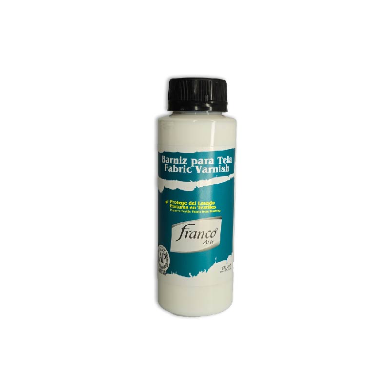 BARNIZ PARA TELA FRANCO ARTE es un protector con acabado final flexible que no amarillea. Protege del lavado, las pinturas para tela y pinturas acrílicas profesionales franco arte ya aplicadas y secas en textiles. Aplíquese sobre las pinturas, brochando suavemente la figura tratando de no aplicar por fuera de la misma. Dejar secar por 72 horas, luego planche por el revés a temperatura media. Manténgase fuera del alcance de los niños. No tóxico. Limpie los implementos con agua. No tóxico.