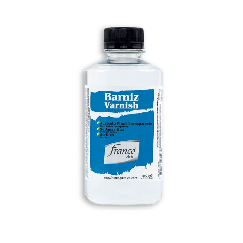 BARNIZ FRANCO ARTE acabado final transparente super brillante que da alta protección, para trabajos realizados en cualquier material crudo o pintado como metal, madera, MDF, cartón, piedra, vidrio entre otros. No utilizar sobre pinturas al óleo. Base solvente. No brochar, solo esparcir poco y suavemente con pincel o con el dedo forrado con un guante. Disolver con Xilol. Limpiar los implementos utilizados con Thinner o Xilol.