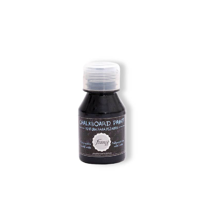 CHALKBOARD PAINT FRANCO ARTE pintura ideal para hacer pizarras, aplíquese sobre cualquier superficie como: paredes, metal, cerámica, madera, MDF, cartón, yeso, papel, corcho, paredes, icopor (poliestireno expandido) entre otros. Limpie los implementos con agua. Manténgase fuera del alcance de los niños. No ingerir. NO TÓXICA.