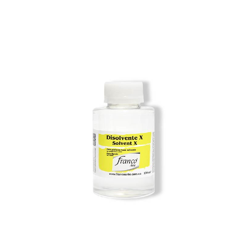 DISOLVENTE X FRANCO ARTE para adelgazar pinturas y medios base solvente como: Oro 24k Metálico, Plata Metálico, Betún de Judea, Barniz y Vitrales Franco Arte. Conserve el envase bien tapado para evitar evaporación del solvente. Manténgase fuera del alcance de los niños. No ingerir. No inhale. Inflamable. Tóxico. Usar en un lugar ventilado. Evite el contacto prolongado con la piel.