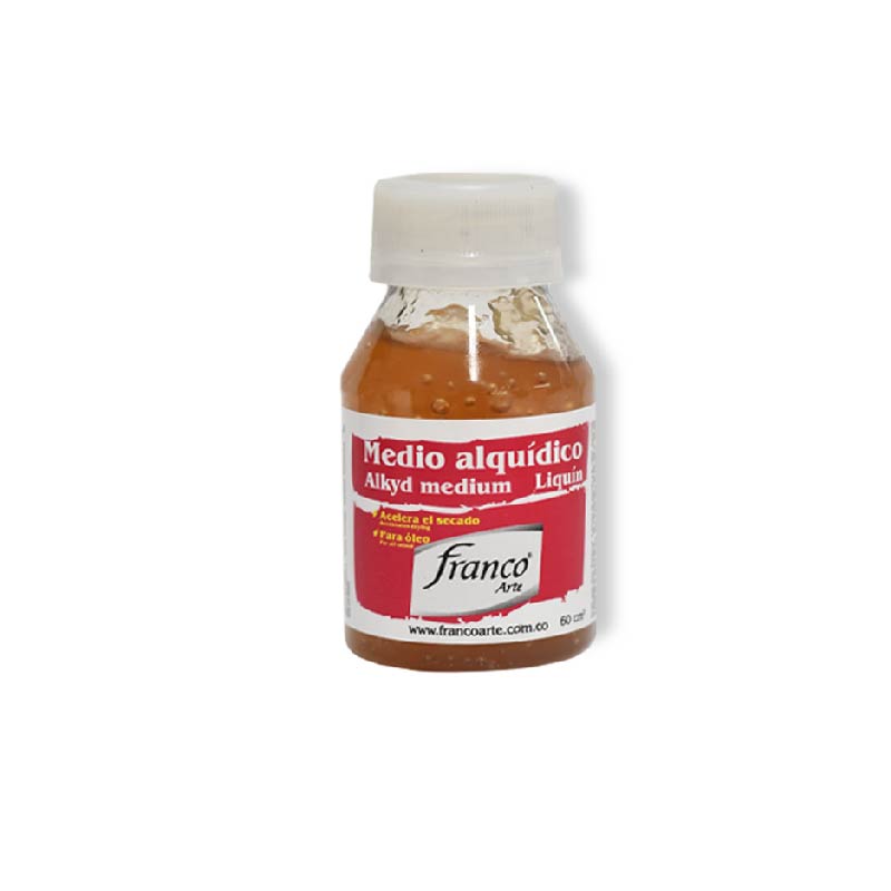 MEDIO ALQUÍDICO FRANCO ARTE para óleo, disminuye el tiempo de secado a la mitad y aumenta transparencia. El medio alquídico disminuye la viscosidad para trabajos con pincel.