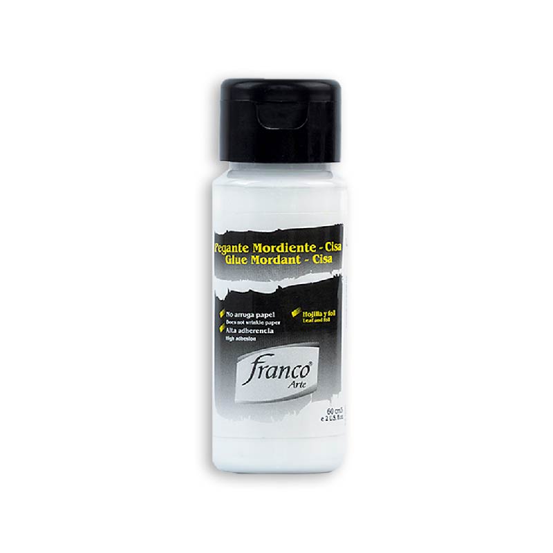 PEGANTE MORDIENTE – CISA FRANCO ARTE para hojilla y foil, especial para pegar sobre, cerámica, madera, MDF, cartón, yeso, papel, entre otros. Aplique una capa delgada de pegante deje secar 10 minutos aproximadamente y luego pegar la hojilla o foil con un pincel seco.