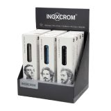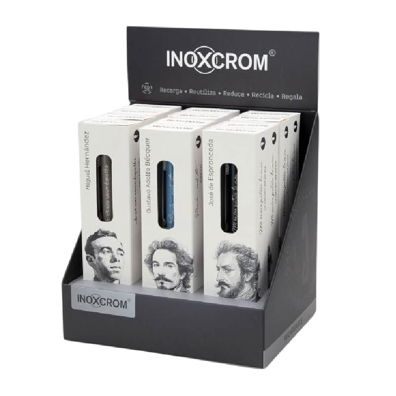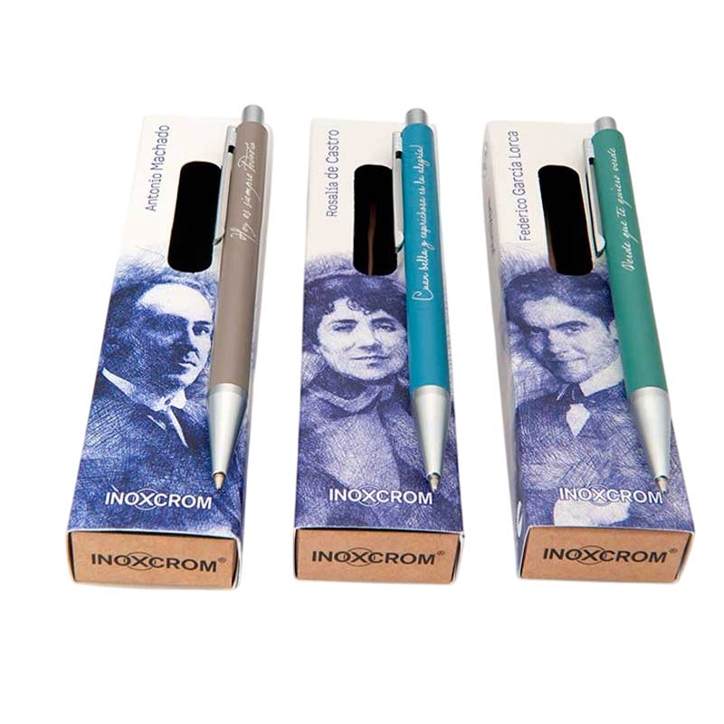 Mecanismo de pulsación, cuerpo de aluminio. Recambio de bolígrafo INOXCROM con punta de acero inoxidable y bola de carburo de tungsteno de 1mm.