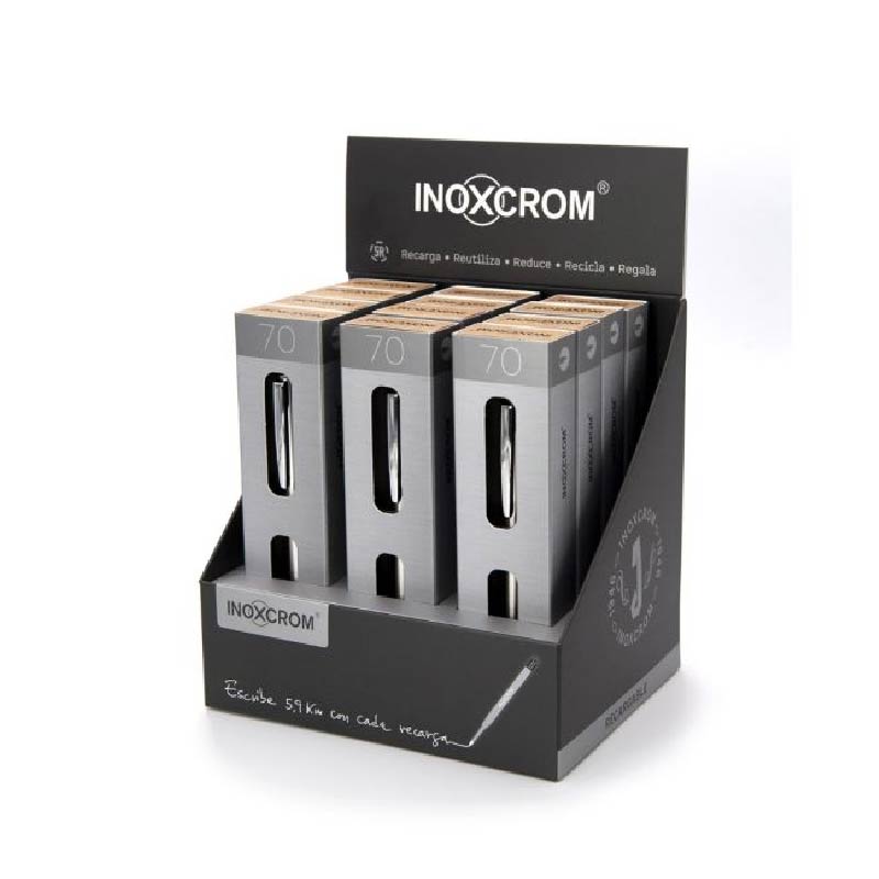 INOX 70 GOLDEN, display de bolígrafos elegantes, finos y discretos con cuerpo de acero inoxidable y mecanismo de pulsación que oculta un recambio con punta de acero inoxidable.
