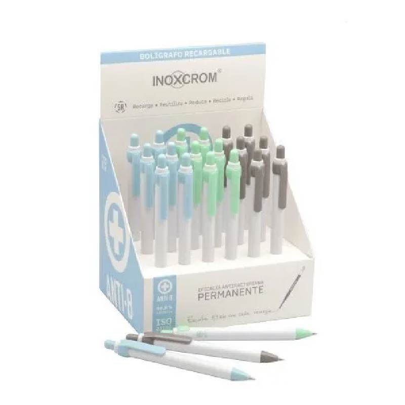 Bolígrafo recargable de ABS enriquecido con iones de plata y zinc que eliminan las bacterias en un 99.9%. Certificado ISO 22196.