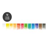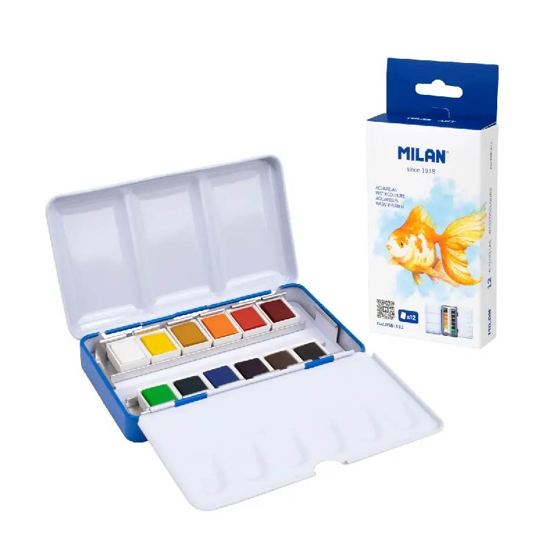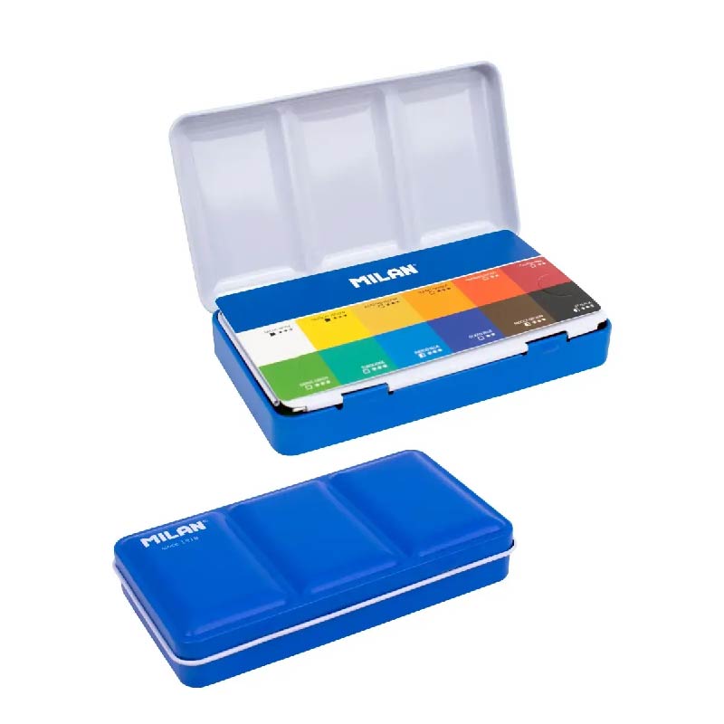 Estuche metálico con 12 pastillas medios godet de acuarela MILAN Art, con bandeja abatible y anilla posterior. Sus colores se obtienen a partir de pigmentos inocuos, son opacos y resistentes a la luz. Se mezclan fácilmente entre sí. Indicado para artistas. Se lavan fácilmente sobre la mayoría de tejidos si se realiza en el momento en que el tejido se mancha de pintura, con envase de cartón con colgador.