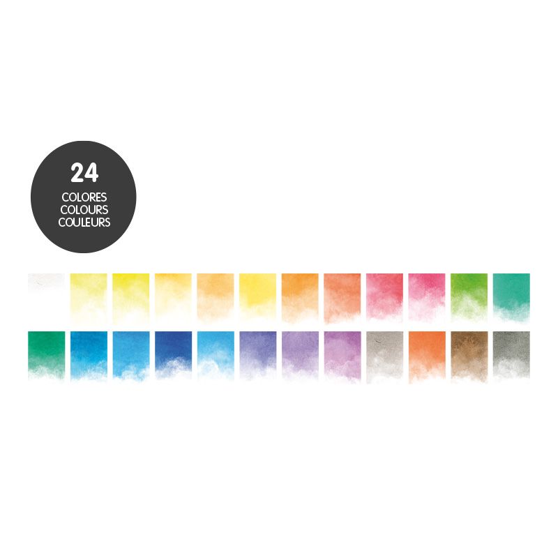 Estuche metálico con 24 pastillas medios godet de acuarela MILAN Art, con bandeja abatible y anilla posterior. Sus colores se obtienen a partir de pigmentos inocuos, son opacos y resistentes a la luz. Se mezclan fácilmente entre sí. Indicado para artistas. Se lavan fácilmente sobre la mayoría de tejidos si se realiza en el momento en el que el tejido se mancha de pintura. Con envase de cartón con colgador.