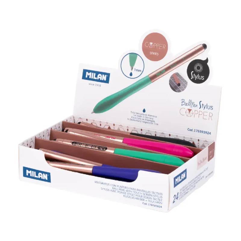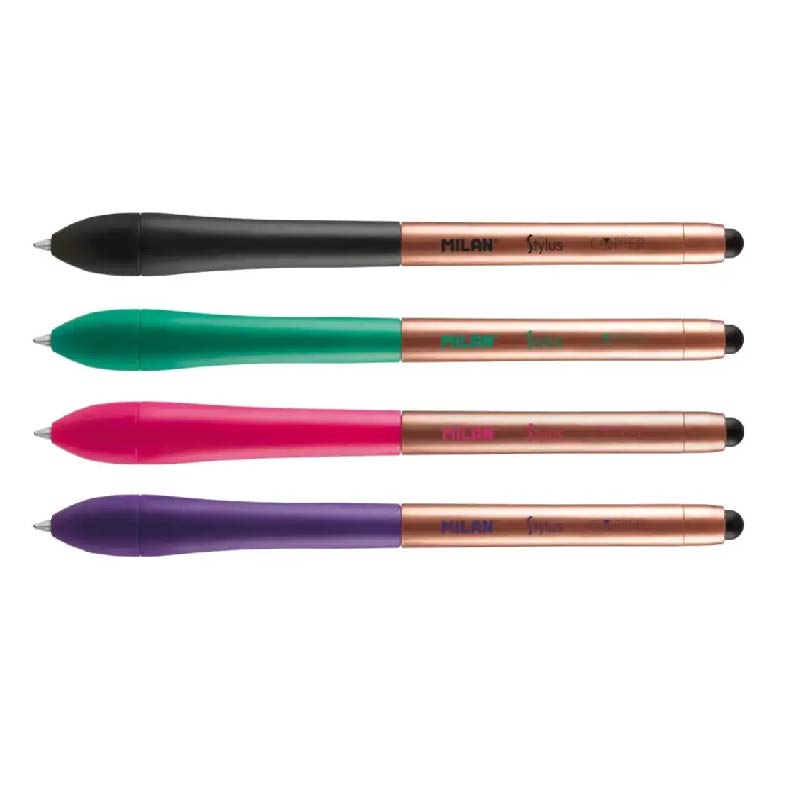 Bolígrafo (tinta de color azul) con puntero para pantallas táctiles Stylus, serie Copper. Disponible en 4 colores combinados con acabado cobre: rosa, lila, negro y verde. Longitud de escritura aproximada: 700 metros. Punta 1 mm.