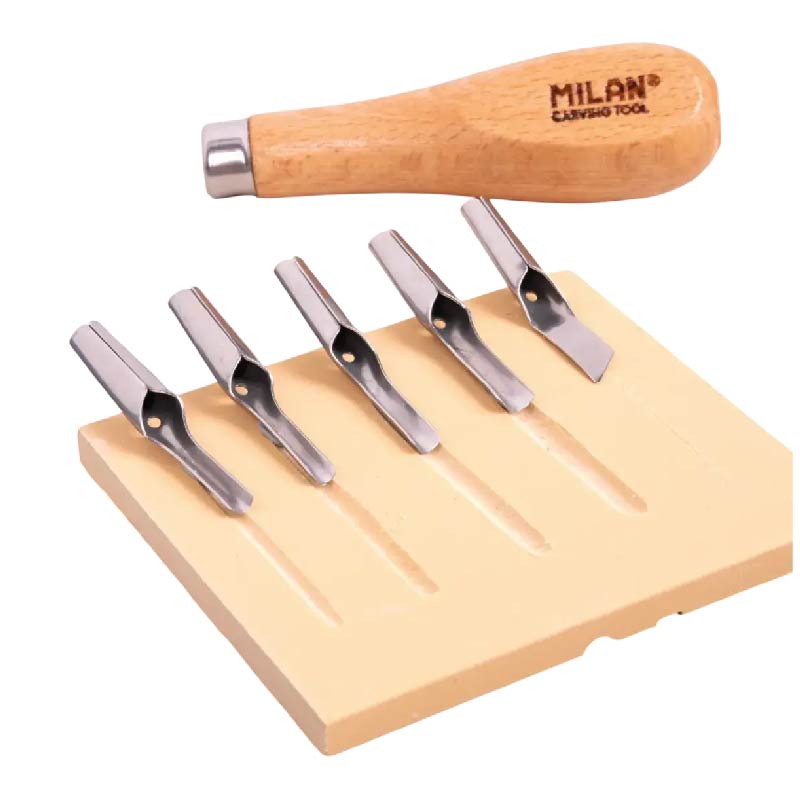 Set de 5 gubias con distintas formas para tallar relieves sobre planchas de grabado y linóleo. Mango de madera.